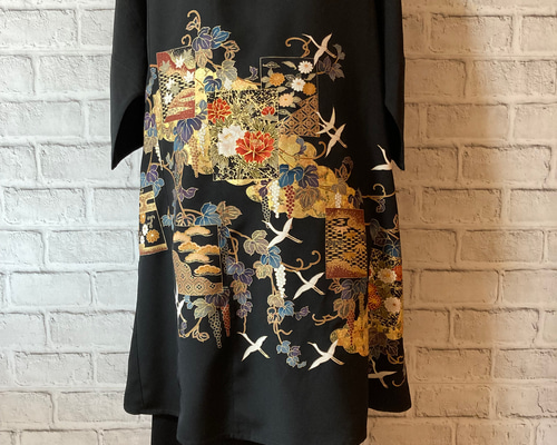 | メーカー | 和柄 黒留袖リメイク 鶴 花柄 ロングワンピース 背中ファスナー 裏地付き 黒F |