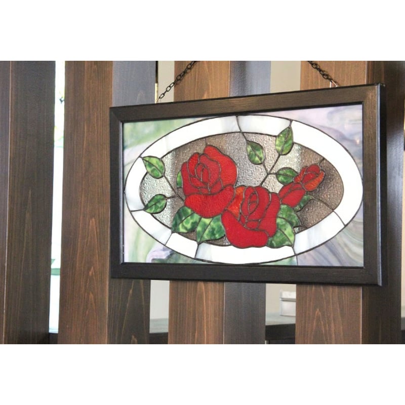 - 美術品・アンティーク・コレクション > 工芸品 > 薔薇があでやかな大きなステンドグラス/宙に浮かぶ常夜灯がまるで浮かんでいる様 薔薇があでやかな大きなステンドグラス/宙に浮かぶ常夜灯がまるで