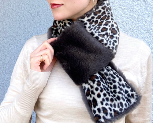 - レディース > ジャケット・アウター > 美品✨ダーマコレクション エコファー ノーカラーコート マフラー M レオパード レオパード柄エコファーのリバーシブルコンパクトマフラー・グレー